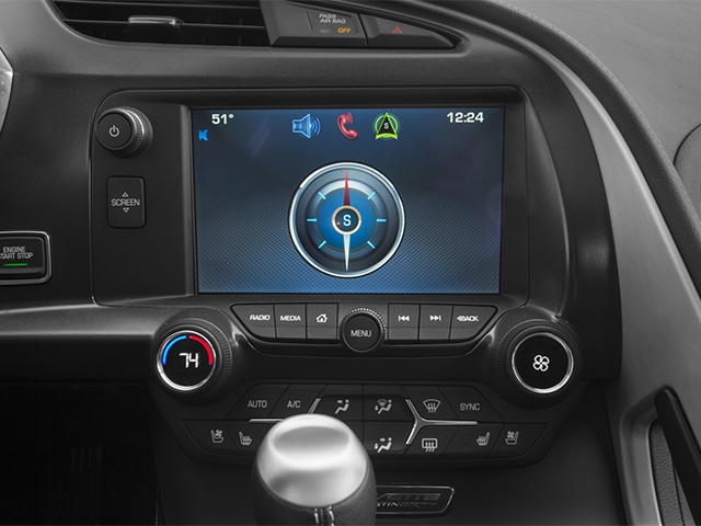 WHEELS, 5-SPOKE, CHROME ALUMINUM 18" x 8.5" (45.7 cm x 21.6 cm) front and 19" x 10.0 " (48.3 cm x 25.4 cm) rear, TRANSMISSION, 6-SPEED PADDLE SHIFT WITH AUTOMATIC MODE, ROOF PANEL, 1-PIECE TRANSPARENT, REMOVABLE, NAVIGATION SYSTEM, LPO, Z51-STYLE SPOILER Genuine Corvette Accessory, REMOTE VEHICLE STARTER SYSTEM, REAR AXLE, 2.56 RATIO, LIMITED SLIP, ENGINE, 6.2L (376 CI) V8 DI (455 hp [339.3 kW] @ 6000 rpm, 460 lb-ft of torque [621.0 N-m] @ 4600 rpm) (STD), AUDIO SYSTEM, 8" DIAGONAL COLOR TOUCH SCREEN DISPLAY WITH CHEVROLET MYLINK, Bluetooth® STREAMING AUDIO FOR MUSIC AND SELECT PHONES, HANDS-FREE SMARTPHONE INTEGRATION, AM/FM STEREO WITH MP3 PLAYBACK AND RADIO DATA SYSTEM (RDS) (STD).