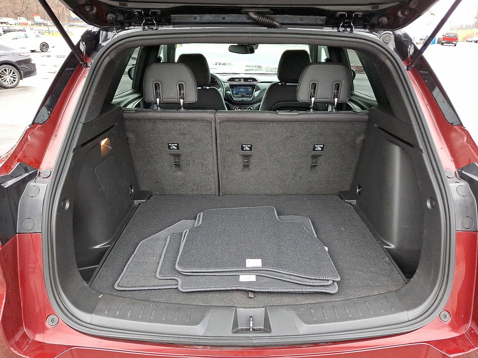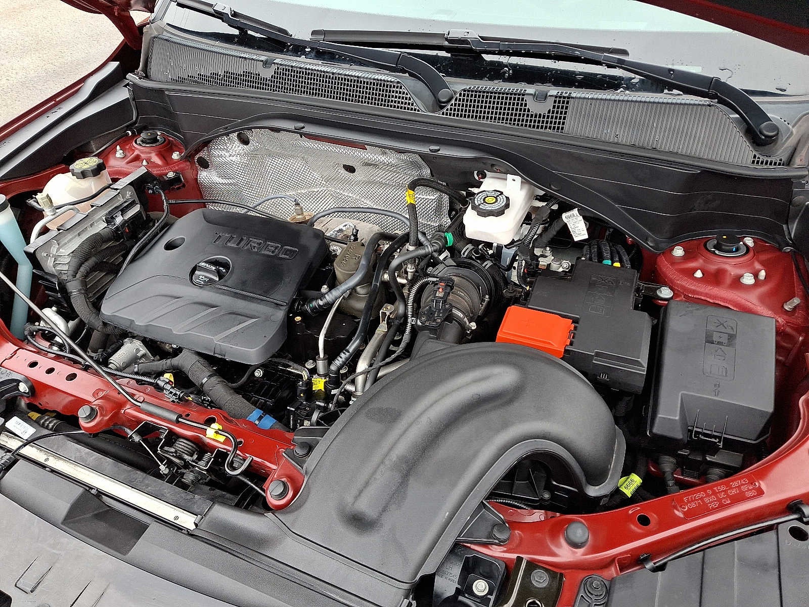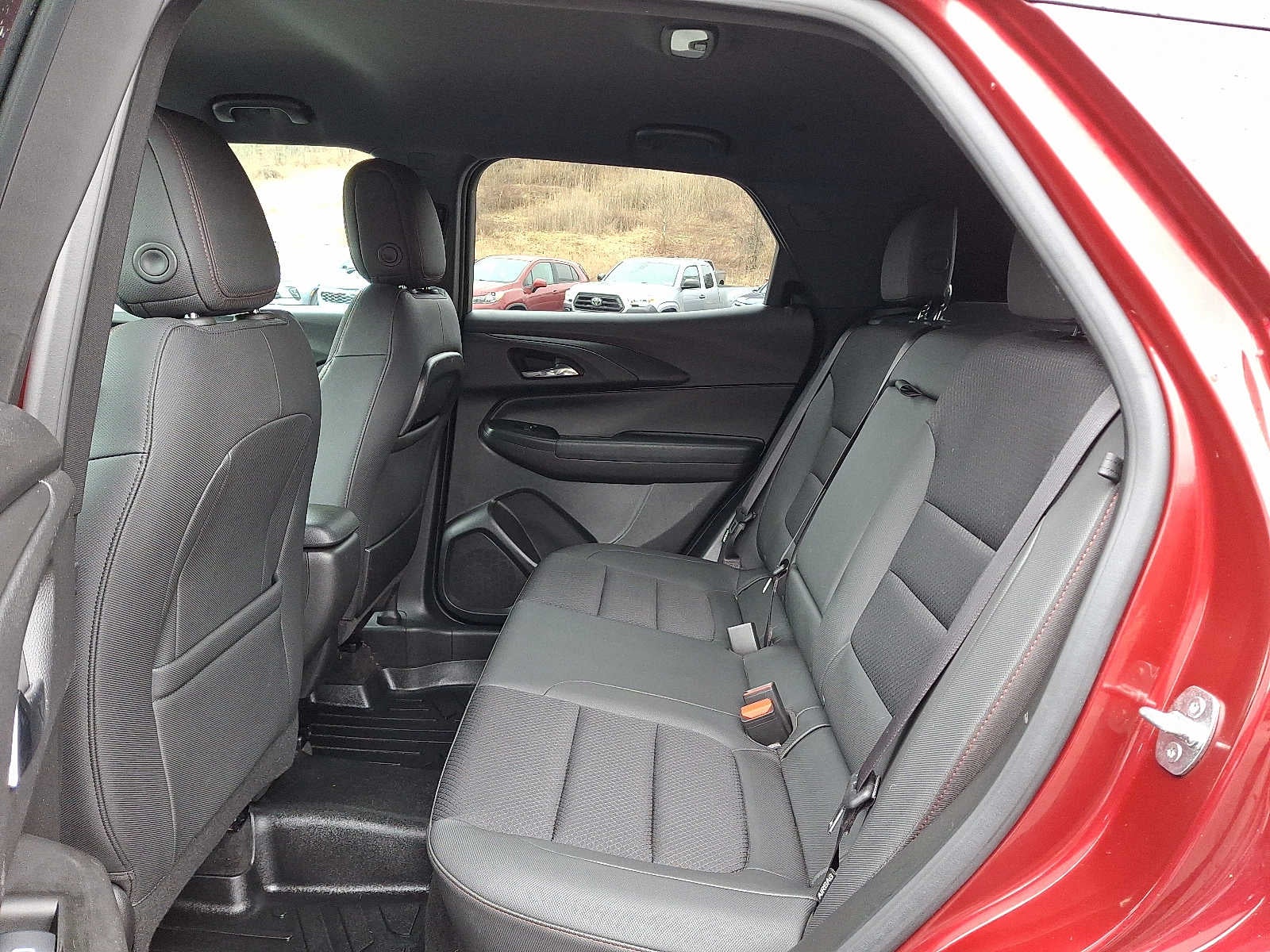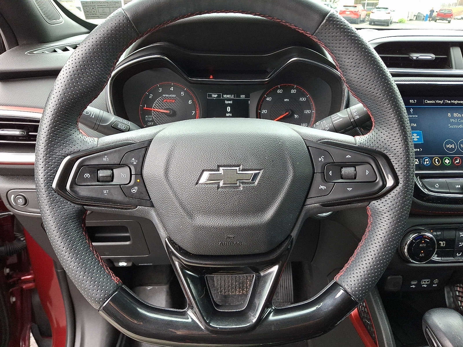 CONVENIENCE PACKAGE includes (C68) automatic climate control air conditioning, (UIJ) 8" diagonal color touchscreen display, (USS) one type-A and one type-C charging only USB ports, (KI6) 120-volt power outlet, (DD8) inside rearview auto-dimming mirror and (DMS) driver and front passenger illuminated vanity mirrors, covered, sliding visors, DRIVER CONFIDENCE PACKAGE includes (UKC) Lane Change Alert with Side Blind Zone Alert, (UFG) Rear Cross Traffic Alert and (UD7) Rear Park Assist (Beginning with start of production through November 28, 2022, vehicles will be forced to include (00Y) Not Equipped with Rear Park Assist, which removes Rear Park Assist. See dealer for details or the window label for the features on a specific vehicle. Beginning December 26, 2022, certain vehicles will be forced to include (060) Not Equipped with Rear Park Assist, which removes Rear Park Assist. Does not include later dealer retrofit. See dealer for details or the window label for the features on a specific vehicle.), AUDIO SYSTEM, CHEVROLET INFOTAINMENT 3 SYSTEM 7" diagonal color touchscreen, AM/FM stereo. Additional features for compatible phones include: Bluetooth® audio streaming for 2 active devices, voice command pass-through to phone, Apple CarPlay® and Android Auto® capable. (8" screen when (ZL3) Convenience Package and (ZL5) Driver Confidence Package are ordered.) (STD), ENGINE, ECOTEC 1.3L I3 TURBO DOHC SIDI WITH VARIABLE VALVE TIMING (VVT) (155 hp [115 kW] @ 5600 rpm, 174 lb-ft torque [236 N-m] @ 1600 rpm) (STD), TRANSMISSION, 9-SPEED AUTOMATIC (STD). Chevrolet RS with Crimson Metallic exterior and Jet Black with Red accents interior features a 3 Cylinder Engine with 155 HP at 5600 RPM*.